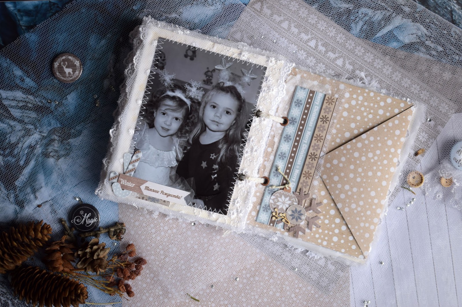 А "спинку" альбомчика украшает шейкер из кружева и фатина, новый год все-таки :-), немного блеска вполне уместно и Полюше наверняка понравится.